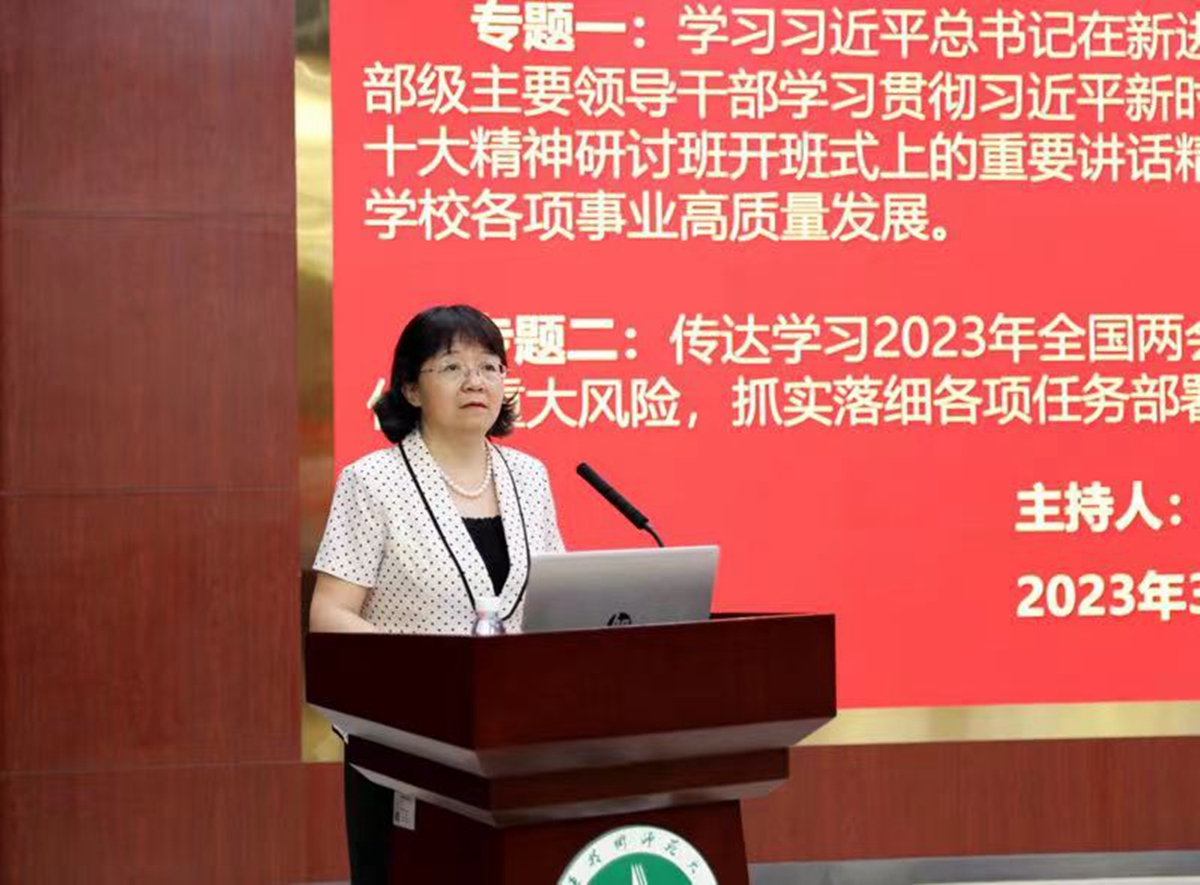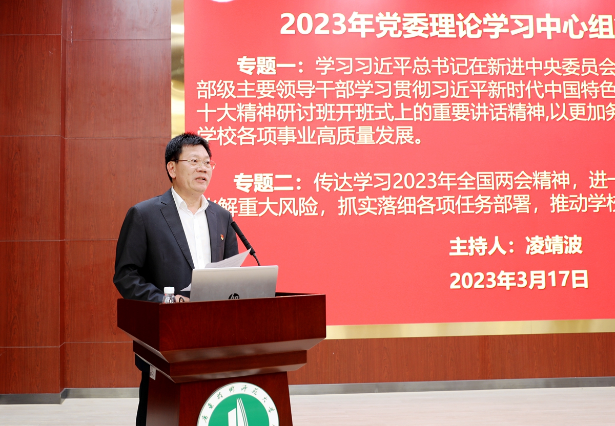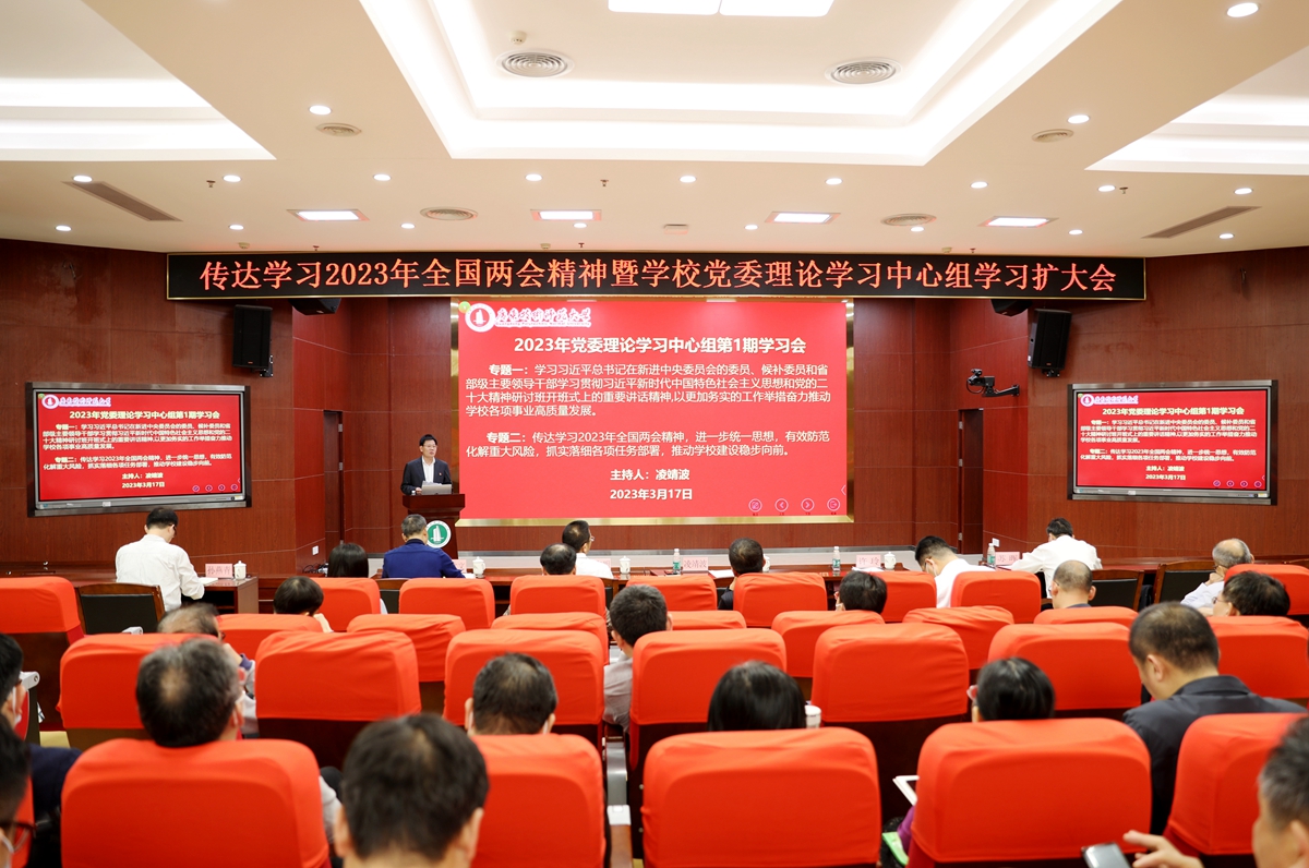 春暖神州日日新,奋楫扬帆再出发。3月17日,学校在东校区208讲学厅举行传达学习2023年全国两会精神暨学校党委理论学习中心组学习扩大会。党委理论学习中心组成员、全体中层干部参加会议。学校党委书记凌靖波主持会议并作专题发言。