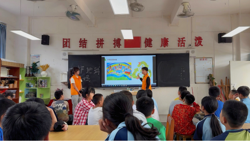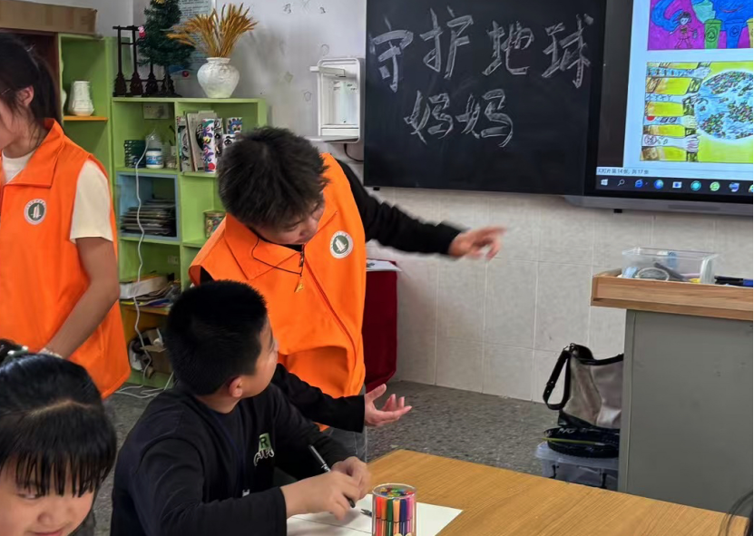 活动开场,团队成员王子纶和朱逸凡作为老师,开始了《艺术守护地球妈妈》主题课程。王老师面带微笑,亲切提问:“小朋友们,你们知道地球妈妈现在正面临着哪些危险吗?”这一问题瞬间像一把神奇的钥匙,打开了孩子们好奇的大门,教室里顿时小手如林,一双双眼睛里闪烁着求知的光芒。紧接着,一段趣味十足的科普视频在屏幕上播放起来,视频里生动呈现了环境污染、资源枯竭等严峻问题。原本热闹的教室安静下来,孩子们紧盯着屏幕,看到地球妈妈“受伤”的模样,他们的眼神里透露出担忧,真切地意识到保护地球已经刻不容缓。