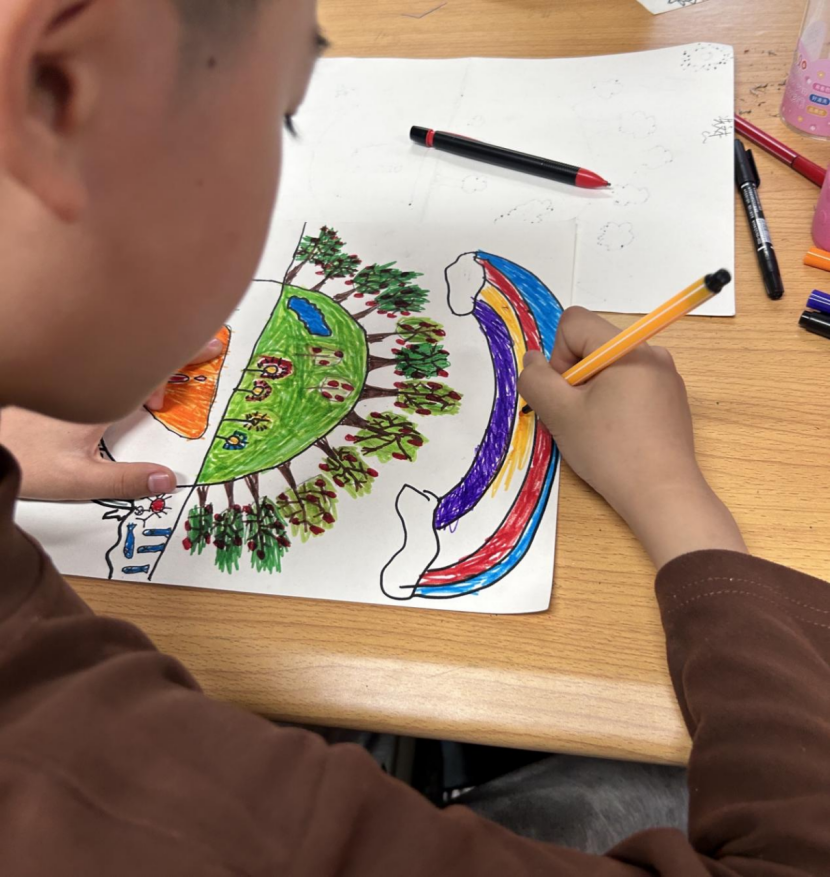 绘画互动体验环节,无疑是活动的高潮时刻。孩子们迫不及待地拿起画笔,纷纷化身“小小艺术家”。在他们的画笔下,地球妈妈的模样丰富多彩:有的孩子画出的地球妈妈被大片郁郁葱葱的森林温柔环绕,可爱的小动物们在林间欢快地玩耍,仿佛在诉说着和谐共生的美好。有的孩子则描绘出清澈见底的河流,鱼儿在水中自由自在地穿梭,泛起层层欢乐的涟漪。每一幅画都童趣满满,更承载着孩子们对地球妈妈深深的热爱。孩子们兴奋地和周围的小伙伴分享自己的作品,你一言我一语地交流着创作灵感,欢声笑语在教室里不断回荡。
