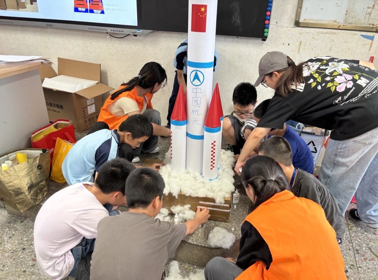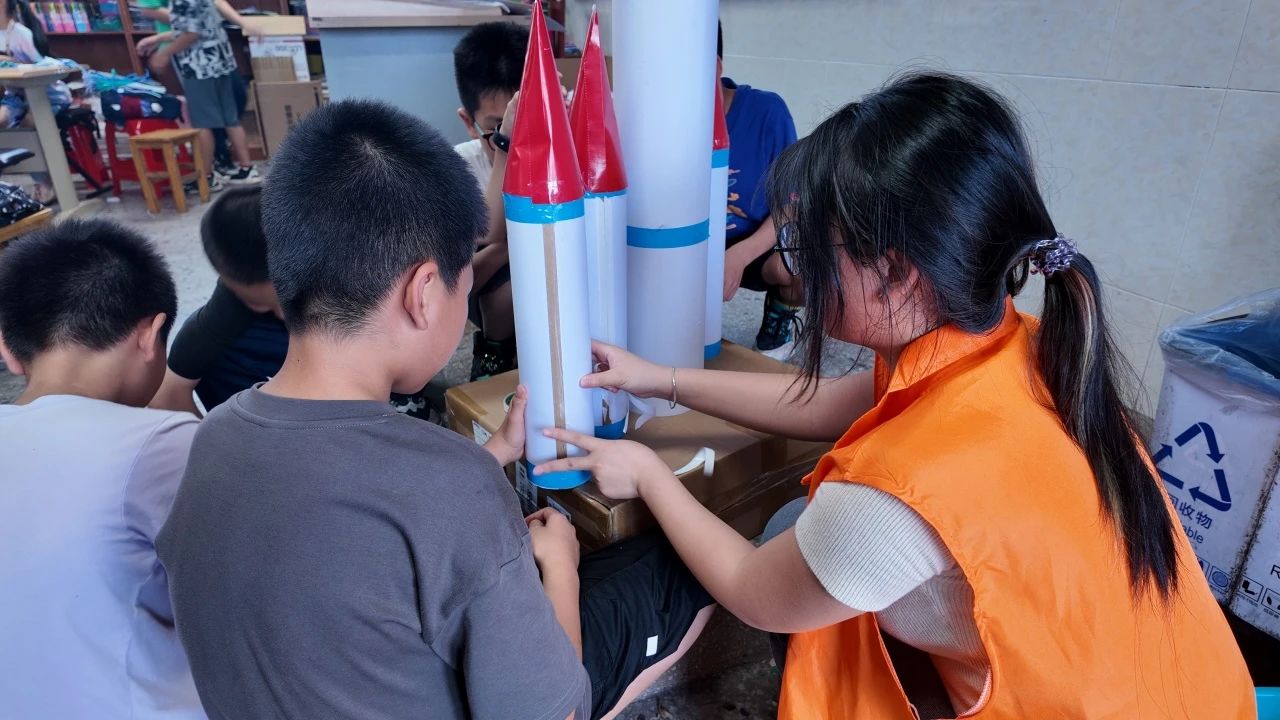 接下来是火箭模型的拼装与上色。同学们一边示范,一边讲述着火箭的构造和航天知识:“小朋友们知道吗?火箭是靠燃料燃烧产生的推力飞向太空的!” 小朋友们睁大眼睛,连连点头,迫不及待地开始动手制作。他们拿起画笔,给火箭涂上自己喜欢的颜色,红色、蓝色、黄色…… 五彩斑斓的火箭仿佛承载着孩子们的航天梦想,即将飞向浩瀚宇宙。